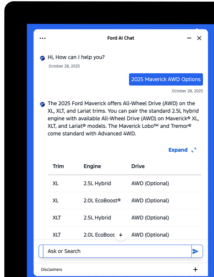 AI chat assistant for Ford.com that helps customers research vehicles, understand features, and get post-purchase support through conversational guidance.