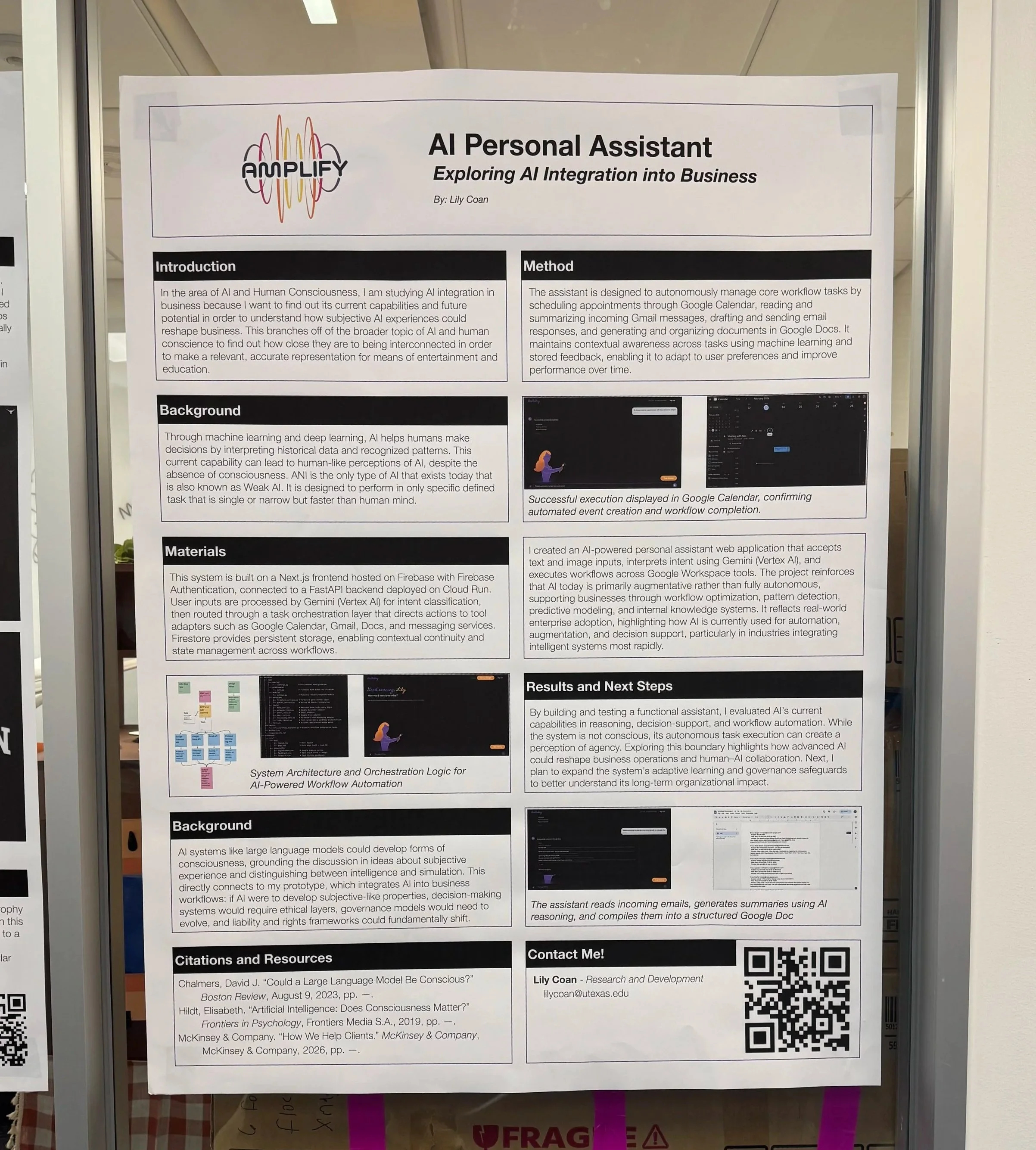 By building and testing a functional assistant, I am evaluating AI’s present capabilities in reasoning, decision-support, and workflow automation. Although the system does not possess consciousness, its ability to interpret context and act autonomously can create the perception of agency. Studying this boundary between task execution and perceived understanding helps explore how increasingly advanced AI systems (potentially evolving toward AGI) could reshape business operations, decision-making processes, and human-AI collaboration.